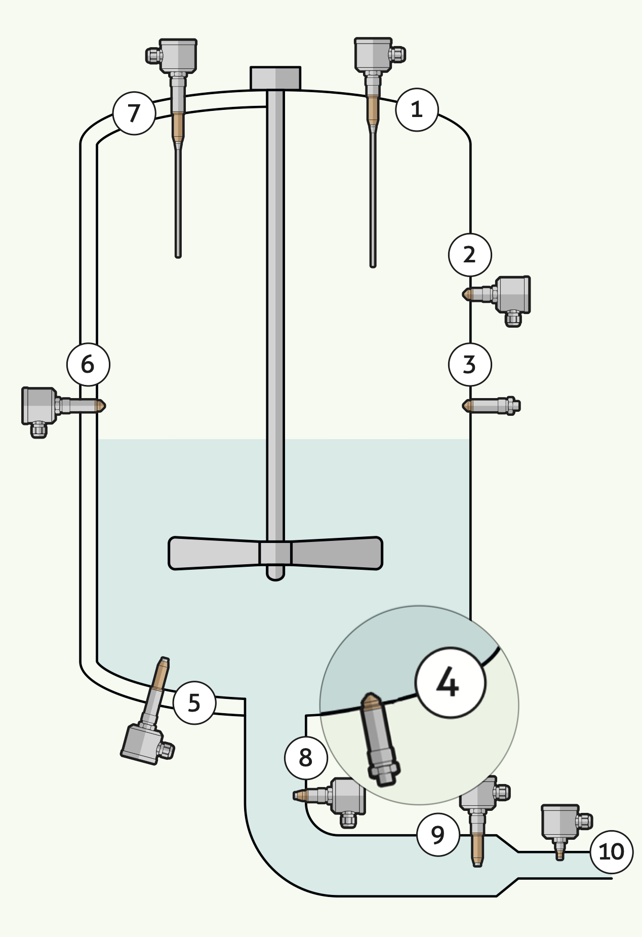 Een point level switch wordt gebruikt in processen waar het nodig is om een specifiek niveau te detecteren. Dit kan zijn om een limiet aan te geven in leidingen of tanks, om een pomp te beschermen tegen drooglopen of om het product in een leiding te monitoren of detecteren. In onderstaande tekening zijn de 10 meest voorkomende toepassingen weergegeven.