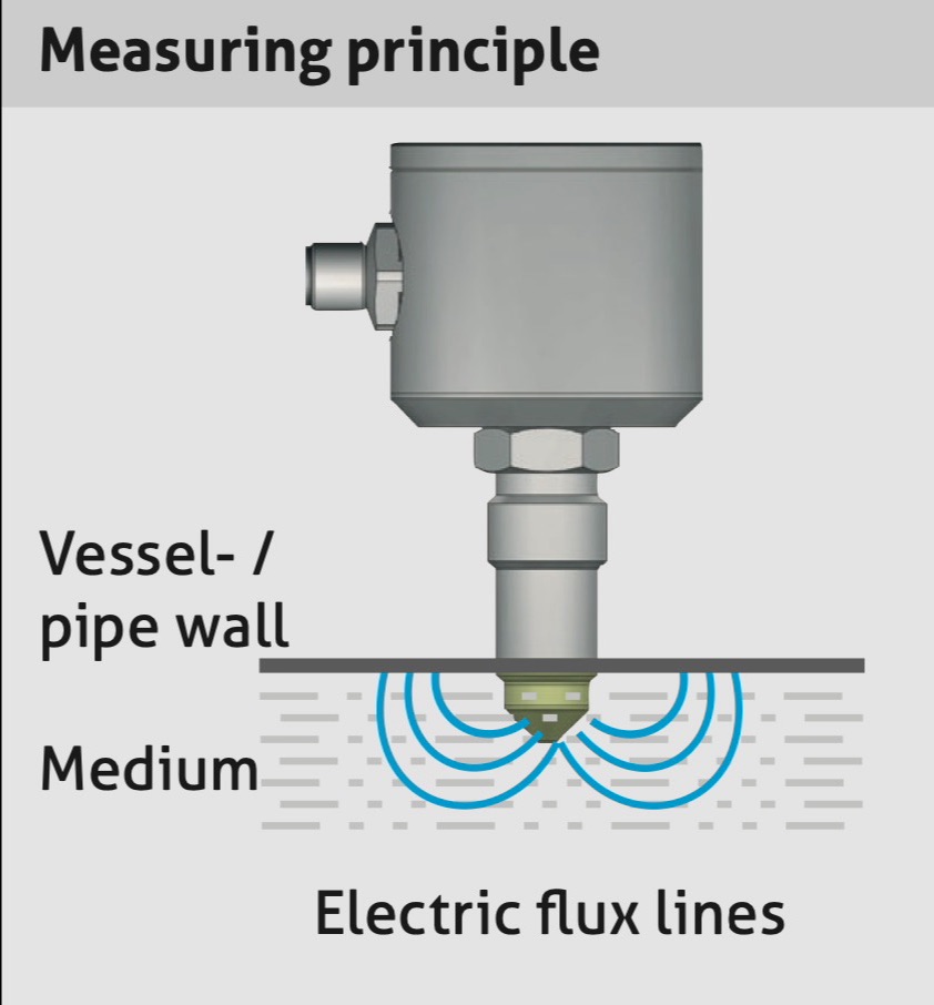 De elektrode van de NCS sensor en het oppervlakte van de tank kunnen gezien worden als condensator, het medium als diëlektrische vloeistof. De capaciteit van een condensator wordt beïnvloed door drie factoren: de afstand en grootte van de elektrodes en het type medium tussen de elektrodes. Bij capacitieve sensoren is alleen het type medium van belang. Omdat het medium een hogere Dk-waarde heeft dan lucht, neemt de capaciteit toe als de sensor bedekt is met het medium. De verandering in capaciteit wordt gemeten en omgezet naar een signaal. Op deze manier is de sensor ongevoelig voor schuim en aanklevingen. In de schematische weergave hieronder is te zien hoe de NCS met behulp van elektrische fluxlijnen constateert of het niveau reeds bereikt is.