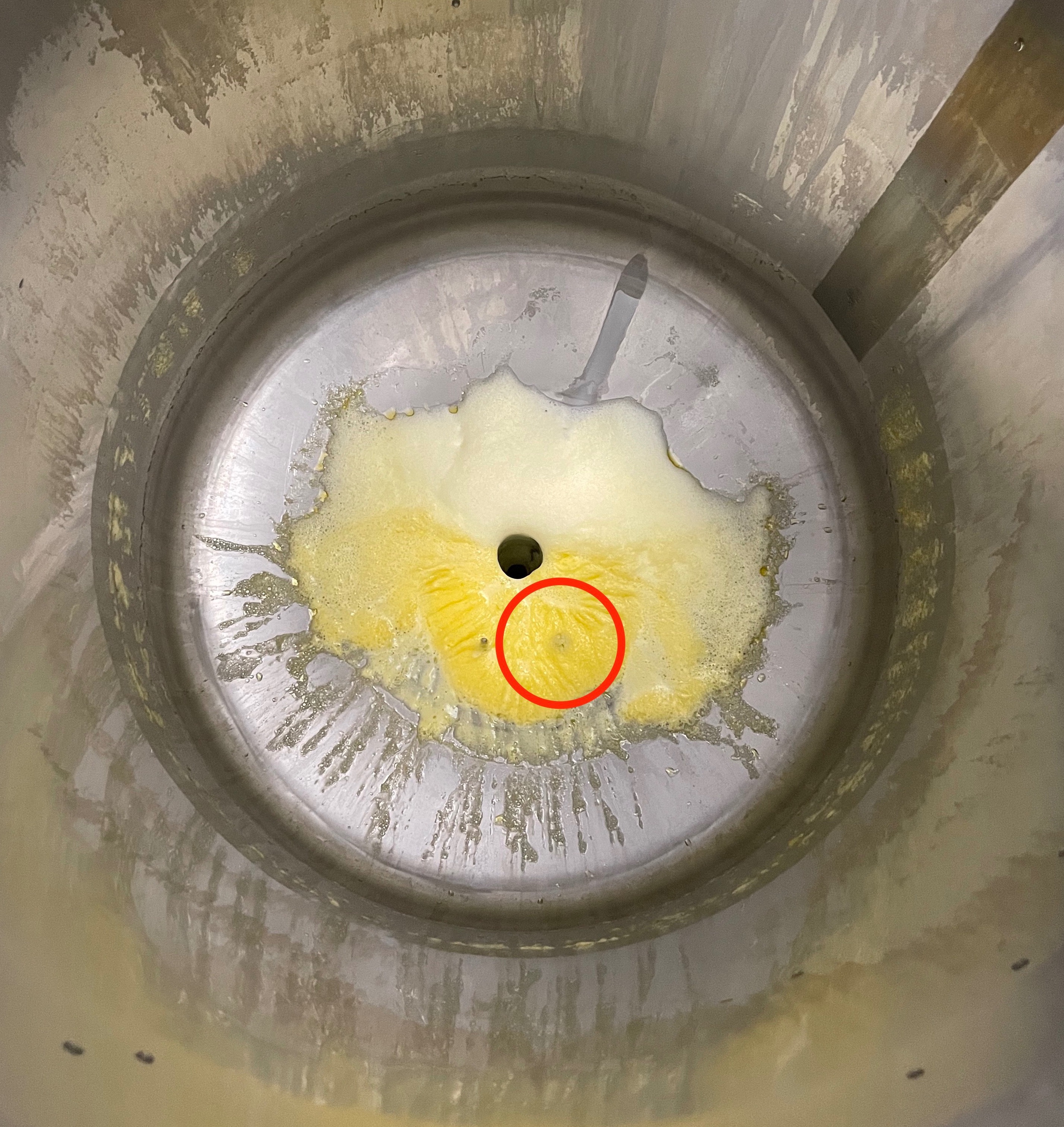 In de foto hieronder is een roomtank te zien. Deze tank is geleegd en op de bodem van deze tank bevindt zich een NCS-M-11 (rood omlijnd, zie ook sensor 4 in de eerder afgebeelde tank) die een signaal geeft als de tank bijna leeg is. Na verloop van tijd ontstaat er bovenop de room een kleverige laag die ongewenste volmelding zou kunnen geven. Met de juiste parameters (het afstellen van de elektrische fluxlijnen) is het gelukt deze NCS de gewenste leegmelding te laten geven, ondanks dat de sensortip bedekt blijft. Voor vergelijkbare toepassingen met media die nog meer aankleving op de sensortip veroorzaken biedt de NCS-L zeker uitkomst. Kortom, Anderson-Negele biedt een betrouwbare point level switch voor iedere toepassing!